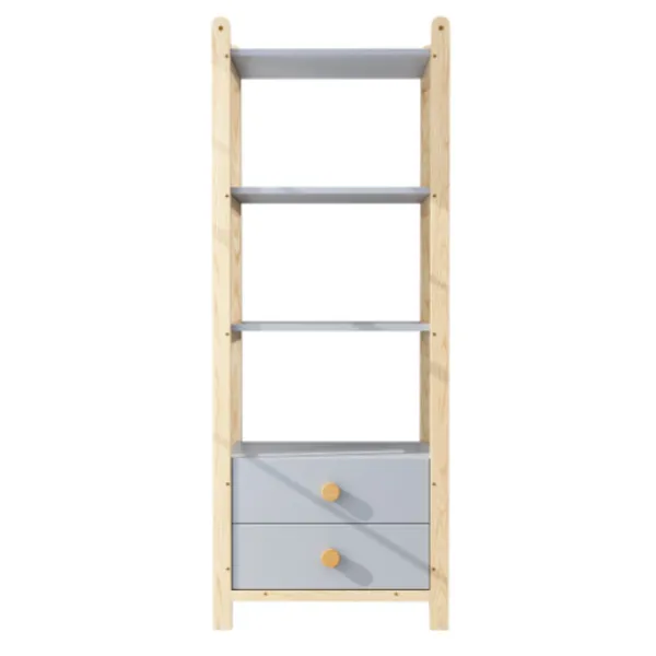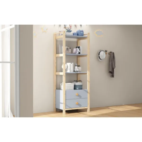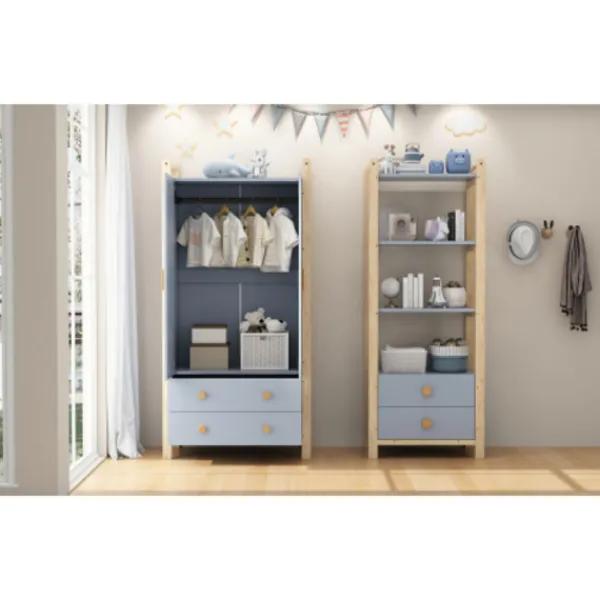 Material: Produkten består av en fururamskonstruktion, blå spånskivekropp och handtag i massivt trä (högkvalitativ materialkombination för stabilitet och hållbarhet, lämplig för sovrum eller barnrum).