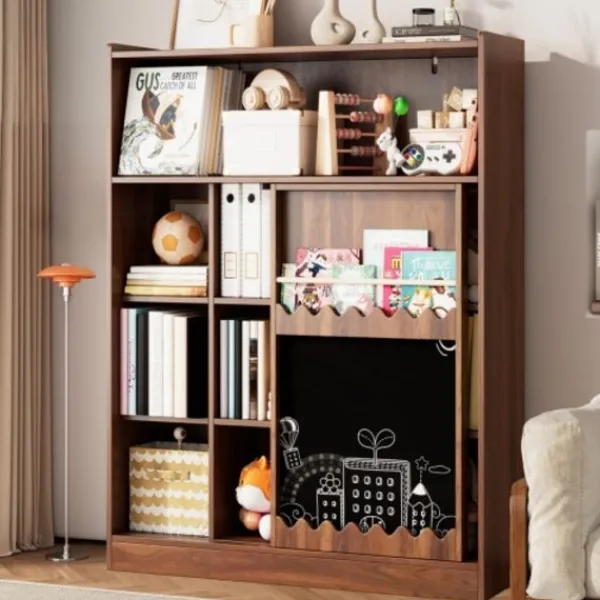 【Multifunktionell användning】 Med en inbyggd griffeltavla för att skriva och rita, låter den barn fånga idéer direkt och utveckla sina konstnärliga färdigheter medan de läser. Perfekt för vardagsrum, kontor eller studierum, den smälter sömlöst in i alla rum. Dess moderna design och rena linjer kompletterar olika inredningsstilar, vilket gör den till en praktisk och idealisk förvaringslösning för alla utrymmen.