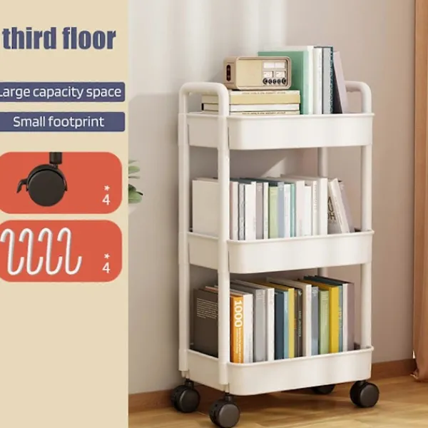 Presenterar det mångsidiga förvaringsstället! Denna fyrvånings rullvagn är en perfekt lösning för att organisera olika föremål i ditt hem. Oavsett om du behöver extra förvaringsutrymme i köket för grönsaker, frukt, kryddor och bestick, eller i vardagsrummet för snacks, böcker och diverseartiklar, så har denna vagn täckt dig.
