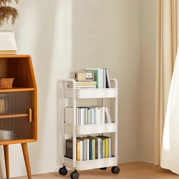 Denna mångsidiga vagn är inte begränsad till bara köket, den kan också användas i badrummet för att förvara handdukar, duschgel, kosmetika och toalettartiklar. Botten på vagnen har en nätliknande ihålig design, vilket främjar luftcirkulation och förhindrar fuktansamling.