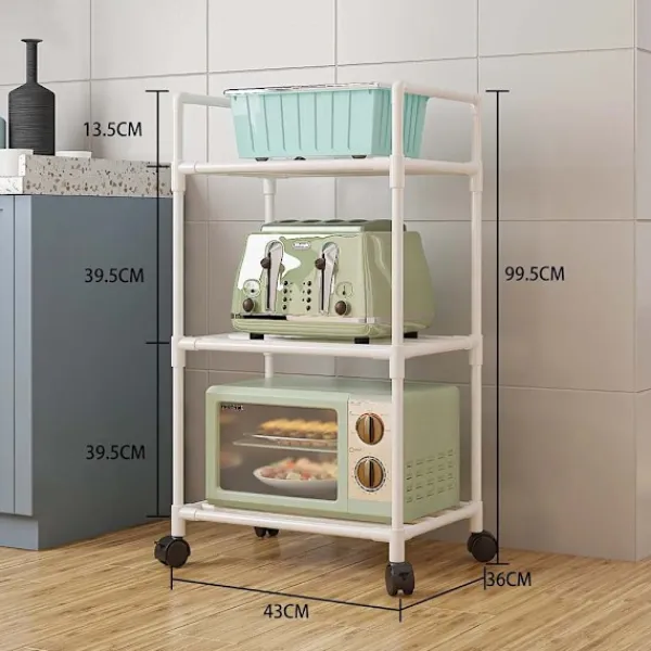 Denna köksförvaringshylla med tre lager är en idealisk lösning för att maximera utrymmet i ditt kök. Med sina generösa dimensioner på 99.5 cm (längd) x 36 cm (bredd) x 43 cm (höjd) erbjuder den gott om plats för att organisera köksredskap, mikrovågsugn, brödrost och andra tillbehör. Den flyttbara designen gör det enkelt att anpassa hyllans placering efter behov, vilket gör den till en praktisk och mångsidig förvaringslösning för alla kök.