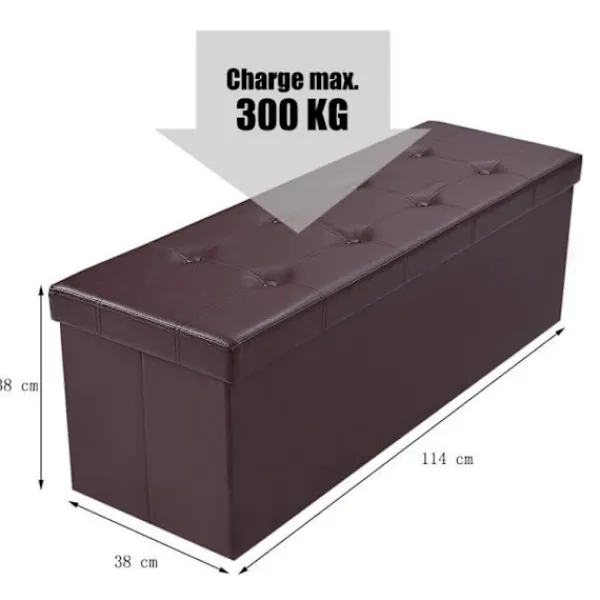 Denna bruna fällstol med förvaringslåda i konstläder (114x38x38 cm) förenar komfort och praktiska fördelar. Den erbjuder ett perfekt förvaringsutrymme för dina saker samtidigt som den klarar upp till 300 kg. Dess moderna design och hopfällbar kapacitet gör den till ett utmärkt val för ditt vardagsrum.