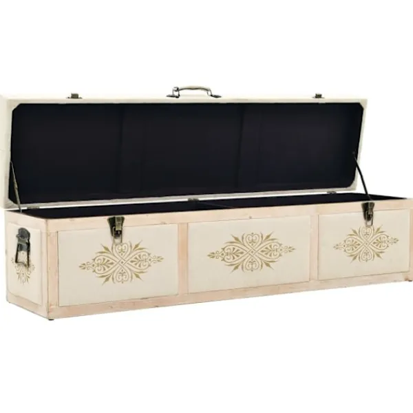 Denna eleganta förvaringsbänk blir ett unikt tillägg i din inredning med sin klassiska design. Den kan även användas som en puff eller förvaringsbox. Den bekväma och vackra bänken är tillverkad i MDF och massivt granträ. Den har en vadderad sits som är klädd i ett modernt tyg. Den har gott om utrymme för att hålla en mängd olika föremål utom synhåll men inom räckhåll. Tack vare sina hållbara handtag kan förvaringsboxen även enkelt flyttas runt i ditt rum.