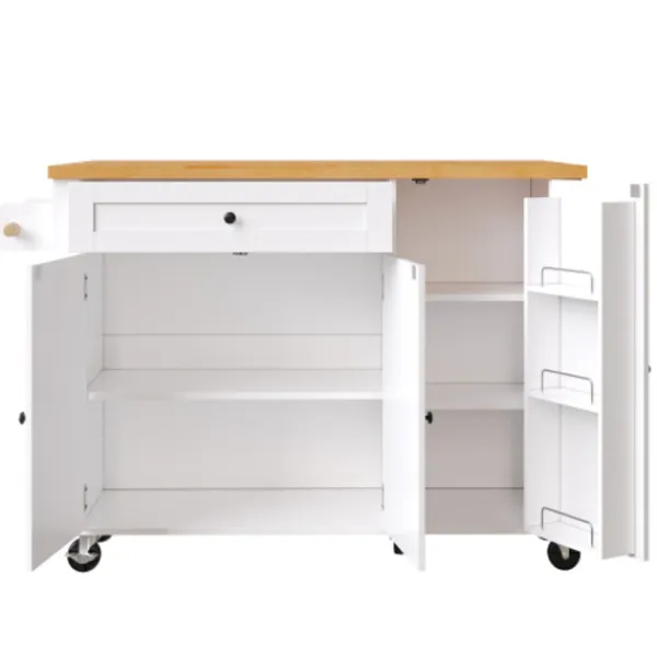 Generös förvaring: Med en stor låda för omfattande förvaring, tre separata dörrar med oberoende fack för att tillgodose olika förvaringsbehov, justerbara hyllor samt handdukshängare och kryddhyllor på båda sidor för ökad bekvämlighet och effektivitet i ditt kök.