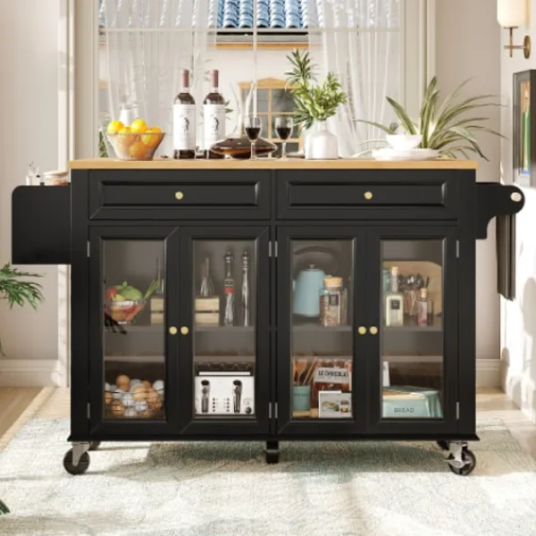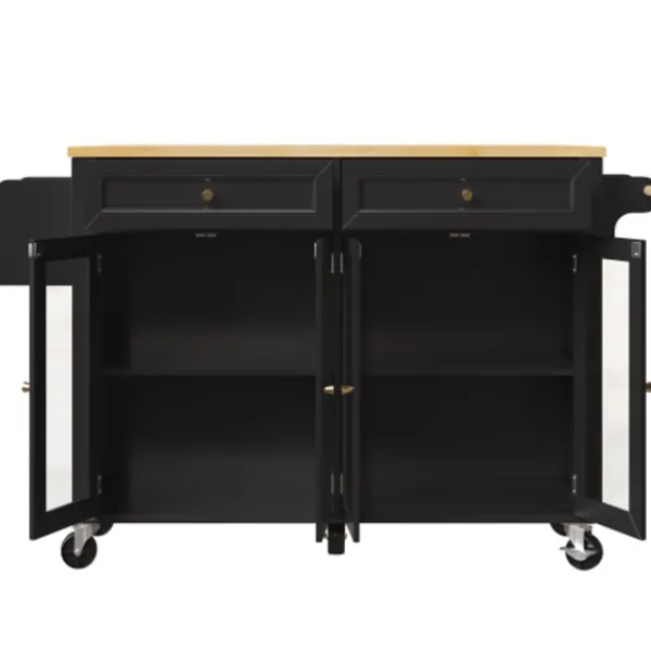 Rymlig multifunktionell vagn: Kombinerar öppna hyllor och stängda lådor. Fungerar som en mobil barvagn eller en praktisk skänk för kök och vardagsrum.