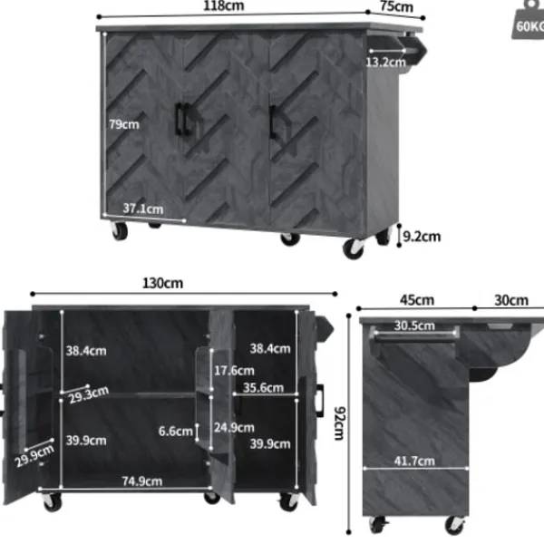 Stabil konstruktion: Metallstödstången på handdukshängaren och skåpshandtagen är tillverkade av högkvalitativ metall som är estetiskt tilltalande och rostbeständig. Hela köksvagnen är konstruerad av högkvalitativa MDF-paneler, vilket garanterar hållbarhet och enkel rengöring. Fem 360-graders svängbara hjul, inklusive två låsbara, möjliggör mångsidig användning i olika miljöer.