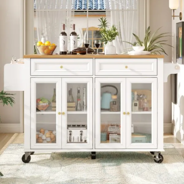 Rymlig multifunktionell vagn: Kombinerar öppna hyllor och stängda lådor. Fungerar som en mobil barvagn eller en praktisk skänk för kök och vardagsrum.