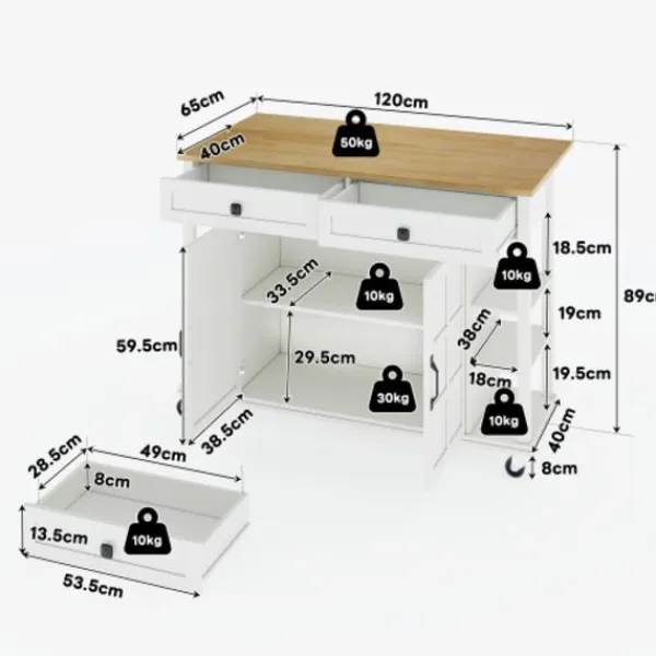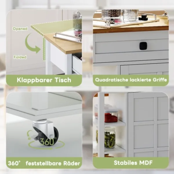 ✅[Utdragbar arbetsyta för mer komfort] Den robusta arbetsytan (18 mm tjock) kan förlängas med ett praktiskt fällbart sidobord från 120 × 40 cm till generösa 120 × 65 cm. Perfekt för att förbereda måltider, servera eller som en extra arbetsplats i köket.