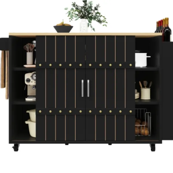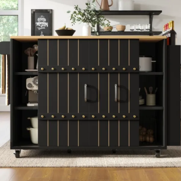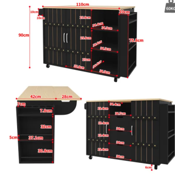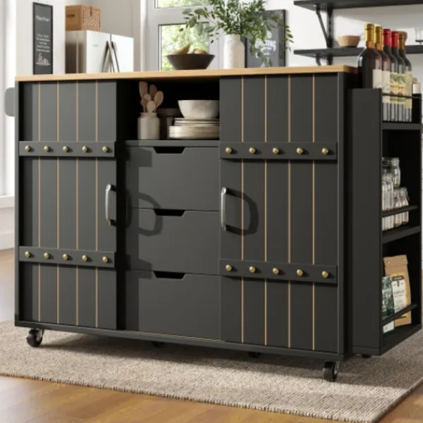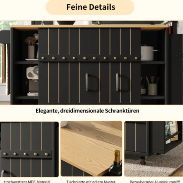 Mångsidigt förvaringsutrymme: Med tre lådor, en sidohylla, en handdukshållare och justerbara hyllor så att bestick, kryddor, vin, drycker och andra köksredskap enkelt kan förvaras.