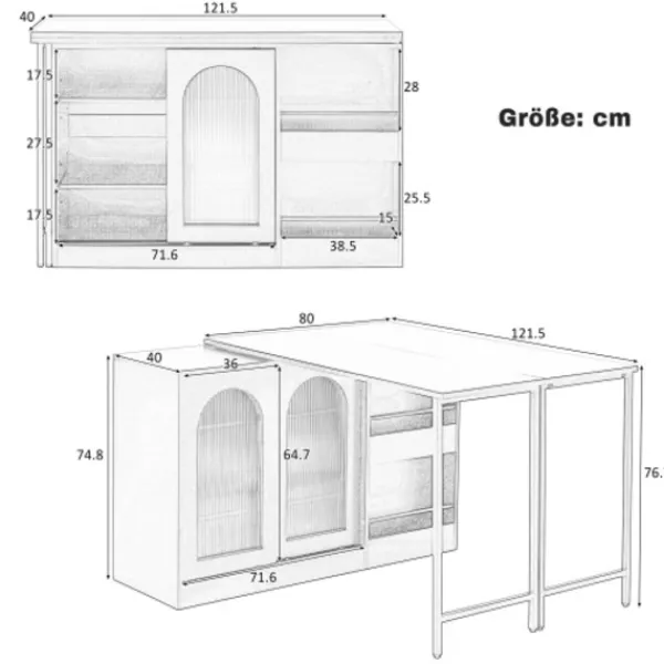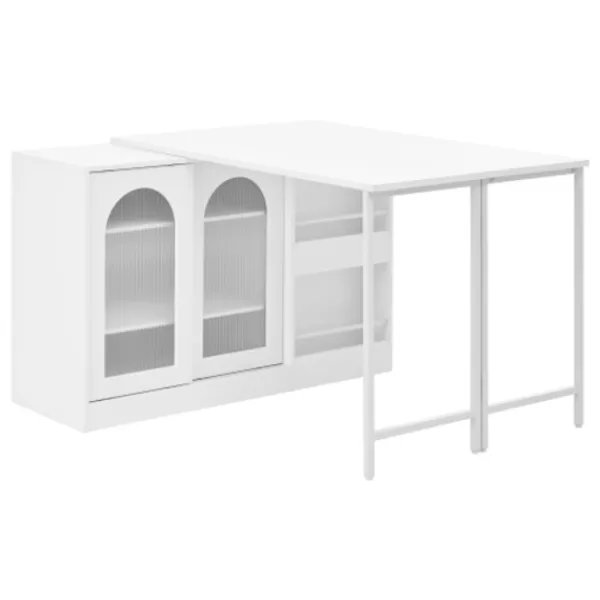 Modern design: Detta eleganta barbord kombinerar modern estetik med praktisk funktionalitet. De stilfulla skjutdörrarna i räfflat glas med en böjd design ger möbeln en tidlös charm, medan dess kompakta men rymliga design är idealisk för en mängd olika köksstilar och vardagsrum. Detta köksbarbord kan användas som ett barbord, en köksö eller ett utdragbart matbord.