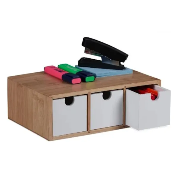 Mångsidig organisatör för skrivbordet. Upptäck den ultimata lösningen för att hålla ditt utrymme snyggt och organiserat med vår mångsidiga lådbox. Denna praktiska organisatör är en allrounder som passar perfekt på skrivbordet, i kontoret, badrummet eller köket. Med sin smarta design och funktionalitet är den idealisk för att hålla ordning på mindre föremål som annars lätt försvinner i röran. Tre rymliga lådor för optimal förvaring. Elegant kombination av naturlig bambu och vitt. Passar alla inredningsstilar. Kan användas som dekorativ hylla. Denna lådbox är inte bara en förvaringslösning utan också en stilfull inredningsdetalj. Kombinationen av naturlig bambu och elegant vitt gör att den smälter in i alla inredningsstilar, från det moderna till det mer traditionella. De tre rymliga lådorna erbjuder gott om plats för att organisera allt från pennor och anteckningar till USB-kablar och smycken. Dessutom kan du använda minibyrån som en dekorativ hylla och placera små blomkrukor eller andra prydnadsföremål på den för att ge ditt rum en personlig touch. Material: Naturlig bambu och vit MDF. Mått: 30 cm x 15 cm x 20 cm. Antal lådor: 3. Färg: Naturlig bambu och vitt. Vikt: 1.5 kg. Denna mångsidiga organisatör är perfekt för den som vill ha en stilren och funktionell lösning för att hålla ordning på småsaker. Oavsett om du behöver en plats för dina kosmetika i badrummet, dina kaffekapslar i köket, eller dina kontorsmaterial på skrivbordet, är denna lådbox det perfekta valet. Med sin hållbara konstruktion och tidlösa design kommer den att vara en pålitlig följeslagare i många år framöver. Mått: Längd: 32.5cm Bredd: 23cm Höjd: 14cm/EA/