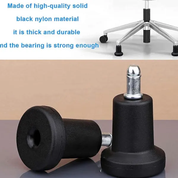 Högkvalitativt MaterialErsättningshjulet för kontorsstolar är tillverkat av högkvalitativ solid svart nylon och rostfritt stålmaterial, förtjockat och hållbart. Lagren är tillräckligt starka för att säkerställa tystnad vid användning av glidningen.