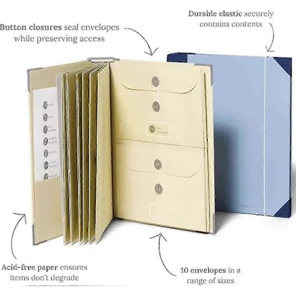 Håll enkelt reda på dina dokument med hjälp av innehållsförteckningen som ingår i denna dokumentorganisatör. Handillustrerade etiketter visar dig vad du ska spara och var. Den främre fickan ger plats för dokument innan de arkiveras, vilket gör denna viktiga dokumentorganisatör otroligt användarvänlig.