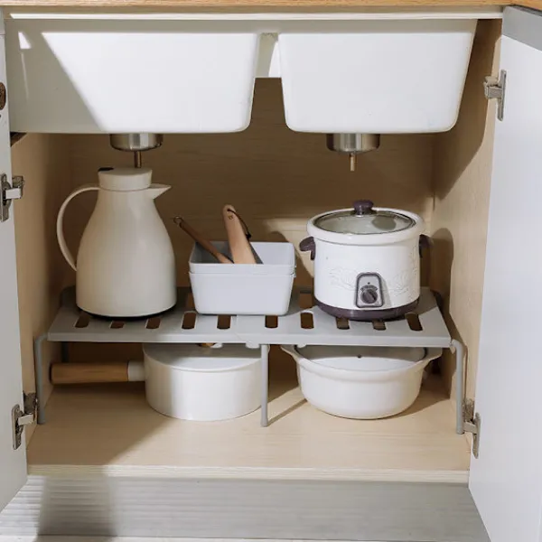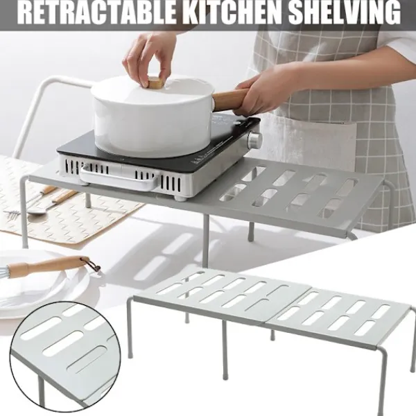 1. EXPANDERBAR SKÅPHYLLA: Infällbar design, du kan ändra storleken på förvaringsutrymmet efter dina behov. Perfekt för att möta dina förvaringsbehov och bänkhyllan kan användas som avlopp för grönsaker och frukt.