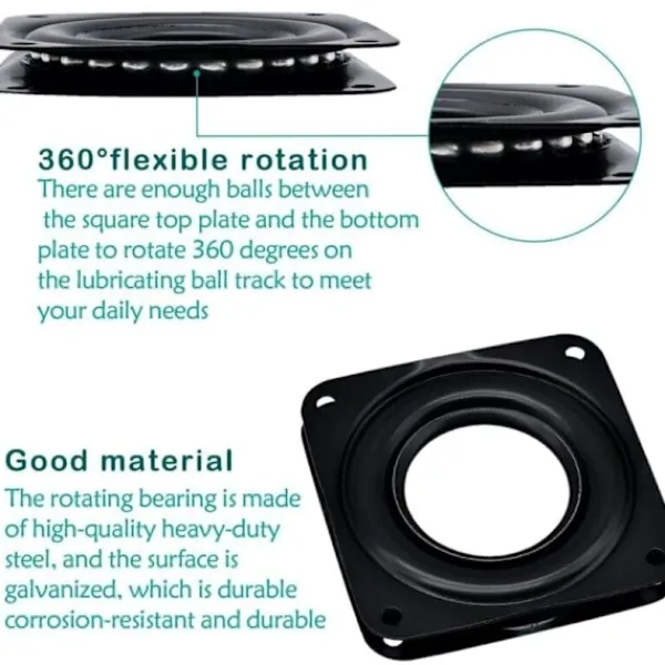 Premiummaterial: De roterande lagren är tillverkade av högkvalitativt, kraftigt stål, galvaniserat, korrosionsbeständigt och hållbart. Den interna installationen av stålkulor uppfyller kraven på flexibilitet hos vridskivan. 360-graders vridning: Flexibla roterande vridlagerfunktioner. Det finns tillräckligt med kulutrymme mellan den fyrkantiga topplattan och bottenplattan, och vridningen är en djupare kulrullning, så kulan är rörlig smidigt. Rimlig design: Den cirkulära spårdesignen på förvarings- och stödboxen minskar risken för överdriven friktion, jämn rotation, hög stabilitet, inget buller. Bekväm installation, inga skador på dina möbler. Stark lastkapacitet: Lätt roterande stödtransmission och utmärkt stödfunktion. Justera rotationen, drivenheten, fixeringen av olika funktioner, lämplig för inomhus- och utomhusmöbelmontering och handgjorda operationer. Bred användning: Vridlagret är ett bra verktyg för möbelmontering och handgjorda. Perfekt för barstolar, matbord, stolar, kontorsstolar, bilbarnstolar, displayställ, TV-stativ, förkläden, roterande skor, skåp etc.