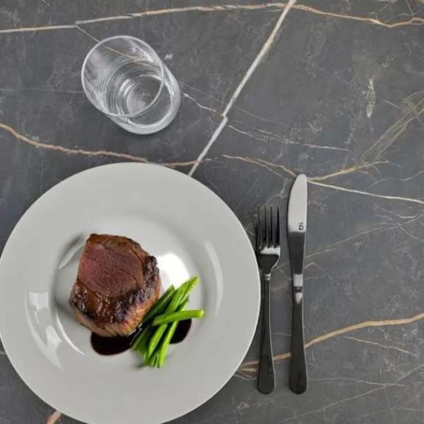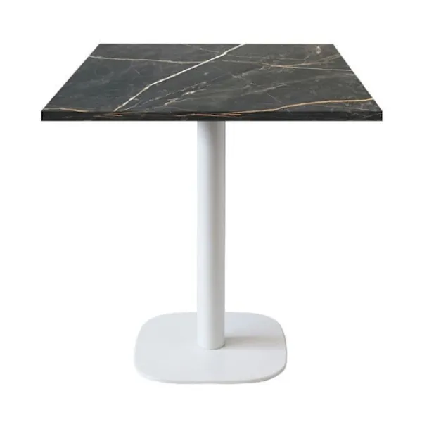 Bord för kök, matsalar eller restauranger, för inomhusbruk. Denna artikel finns även som ståbord. Europaprodukt av hög kvalitet och noggrant utförande: skivan tillverkad i Frankrike, ben tillverkade i Italien. Underrede i pulverlackerad gjutjärn – vit. Skiva i fukttålig spånskiva med laminatfanér och kanter i PVC. Underrede: bas 42×42 cm, pelare Ø 7,6 cm, vikt 15 kg, höjd 73 cm. Levereras med justerbara fötter för ojämna golv. Skiva: 70 x 70 cm, tjocklek 2,9 cm, vikt 8,9 kg, kapacitet för 2/3 personer. Undersidan av skivan i vit melamin. Skivan förborstad med insatser för perfekt fäste till underredet. Levereras som byggsats, enkel montering, skruvar ingår. Mycket eftertraktad material inom storkök för dess egenskaper: hygien och hållbarhet. Lätt att underhålla: rengöring med lätt såplösning eller mild desinfektionsmedel, utan rengöringsmedel eller slipmedel. 100% europeisk produkt.
