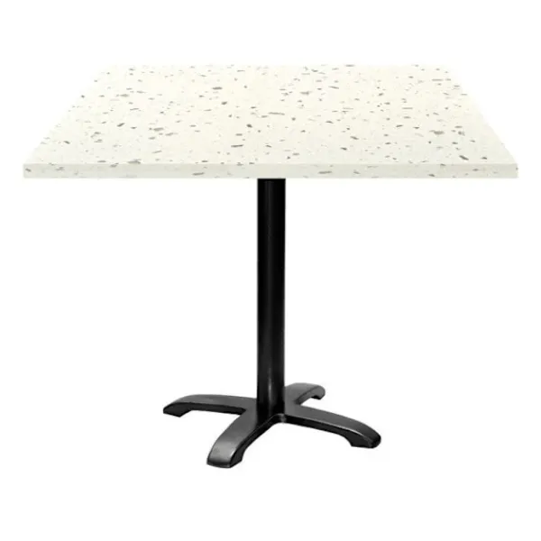 Bord för kök, matrum eller restauranger, för inomhusbruk. Denna artikel finns även i fyrkantig 70 x 70, rektangulär 120 x 70 och 160 x 80, rund Ø 80 cm och Ø 110 cm. Produkt av hög kvalitet och noggrant utförande från Europa: skivan tillverkad i Frankrike, foten tillverkad i Italien. Underrede i termolackerad gjutjärn – svart. Skiva i fuktskyddad spånskiva med laminatoch PVC-kant. Underrede: bas 56×56 cm, pelare Ø 7,6 cm, vikt 12,7 kg, höjd 71 cm. Levereras med justerbara fötter för ojämna golv. Skiva: 90 x 90 cm, tjocklek 2,9 cm, vikt 14,7 kg, kapacitet 4 sittplatser. Undersidan av skivan i vitt melamin. Skivan förborra med insatser för perfekt fästning till underredet. Levereras som kit, enkel montering, skruvar ingår. Mycket eftertraktad material inom storkök för sina egenskaper: hygien och hållbarhet. Lättskött: rengöring med lätt såpvatten eller milt desinfektionsmedel, utan rengöringsmedel eller slipande medel. Produkt 100% europeisk.