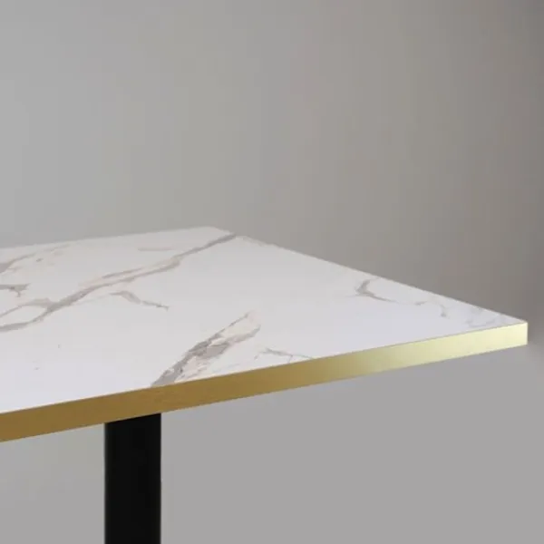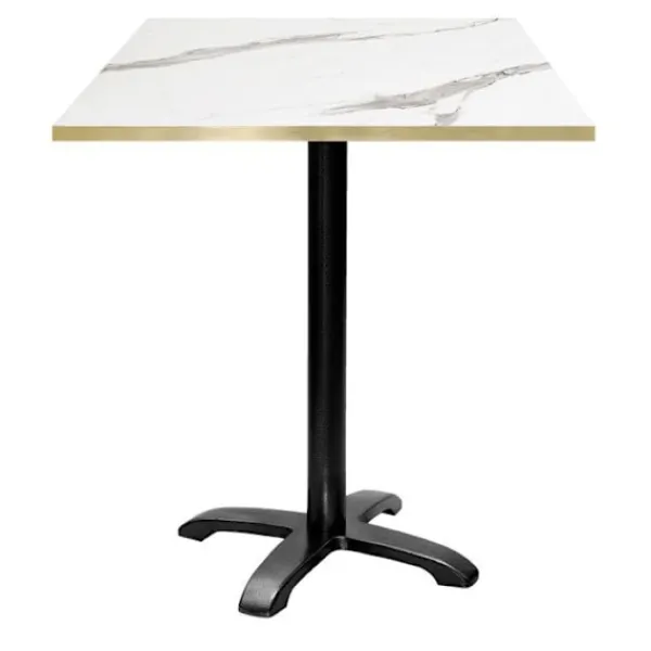 Ståbord för kök, matrum eller restauranger, för inomhusbruk. Denna artikel finns även som standardhöjd bord. Europaprodukt av hög kvalitet och noggranna detaljer: skiva tillverkad i Frankrike, ben tillverkade i Italien. Stativ i thermolackerad gjutjärn – svart. Skiva i fuktskyddat spånskivor med laminat och kanter i PVC färg mässing. Stativ: bas 56×56 cm, pelare Ø 7,6 cm, vikt 17 kg, höjd 110 cm. Levereras med justerbara fötter för ojämna golv. Skiva: 70 x 70 cm, tjocklek 2,9 cm, vikt 8,9 kg, kapacitet 2/3 personer. Undersidan av skivan i vit melamin. Skivan förborarad med insatser för perfekt fastsättning på stativet. Levereras i kit, enkel montering, skruvar ingår. Materialet är mycket efterfrågat inom kollektivtrafik för sina egenskaper: hygien och hållbarhet. Lättskött: rengöring med lätt såpvatten eller mild desinfektant, utan rengöringsmedel eller abrasiva ämnen. 100% europeisk produkt.