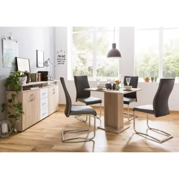 Detta moderna och eleganta matbord har plats för 4 personer. Den är gjord av spånskiva med ekdekor. Tveka inte att upptäcka våra matchande stolar och hitta det du letar efter!… Se presentationen