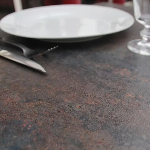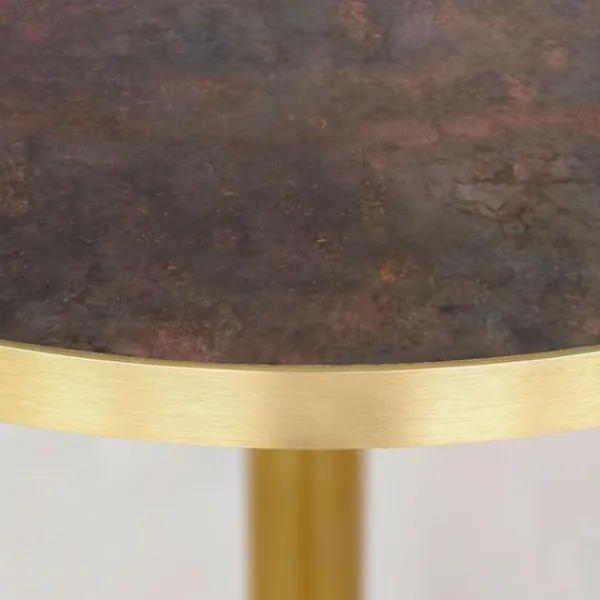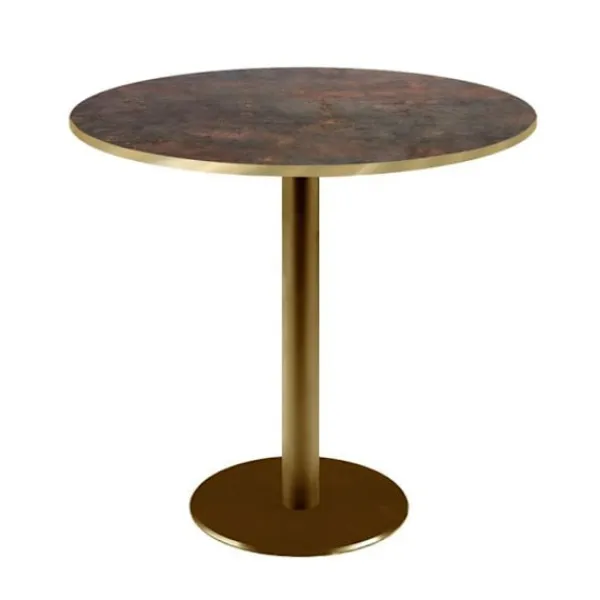 Bord för kök, matplatser eller restauranger, för inomhusbruk. Denna artikel finns också i 70 x 70 cm, Ø 120 cm samt som barbord Ø 60 cm och 60 x 60 cm. Europaprodukt av hög kvalitet och noggrant utförande: skivan tillverkad i Frankrike, fot tillverkad i Italien. Underredet i thermolakad gjutjärn – metallguld. Skivan i vattenbeständig spånskiva med foliebeläggning och kanter i PVC i mässingfärg. Underrede: bas 42×42 cm, pelare Ø 7.6 cm, vikt 15 kg, höjd 73 cm. Försedd med justerbara fötter för ojämna golv. Skiva: Ø 70 cm, tjocklek 2,9 cm, vikt 7 kg, kapacitet 2 sittplatser. Undersidan av skivan i vit melamin. Skivan förberedd med infällda gängor för perfekt fastsättning till underredet. Levereras i kit, lätt montering, skruvar ingår. Mycket eftertraktat material inom storkök för sina egenskaper: hygien och hållbarhet. Lättskött: rengöring med ljummet såpvatten eller mild desinfektion, utan rengöringsmedel eller slipmedel. 100% europeisk produkt.