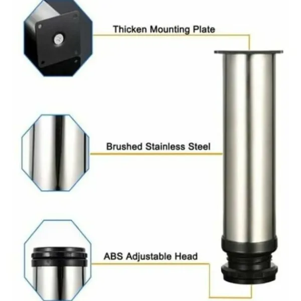 Storlek: 50mm x 250mm (Diameter x Höjd) Material: 304 rostfritt stål + solid ABS Justerbar total höjd: 250mm-265mm Höjdjustering: 0 till 5 15mm längre. Applikation: Tillbehör för bänkskivor, bord, frukostbarer, skrivbord, DIY-möbler, skåp, hyllor, etc.
