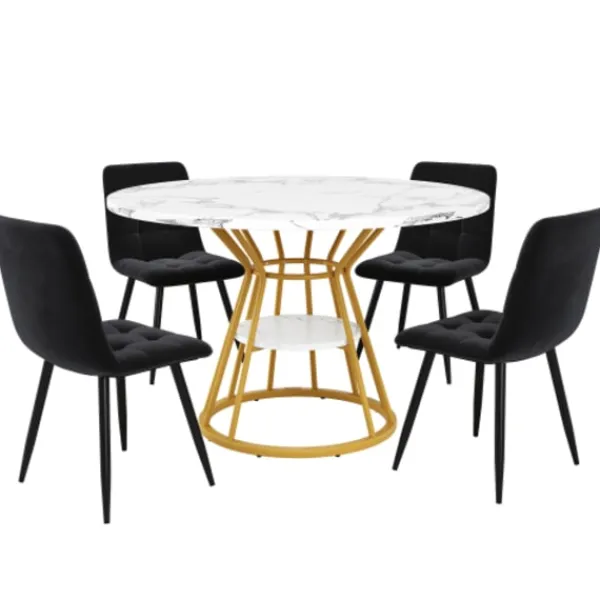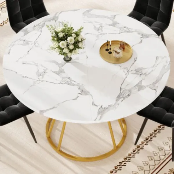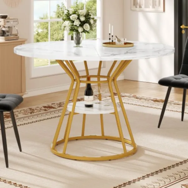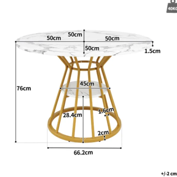Högkvalitativt material: Bordsskivan är tillverkad av förstärkt MDF-material med marmorfinish, vilket inte bara ser vackert och elegant ut utan också säkerställer en stabil och hållbar bordsstruktur och en hög lastkapacitet. Utrustad med metallstödrör för att säkerställa bordsskivans stabila lastkapacitet och ytterligare hyllor på benen för ökat förvaringsutrymme.