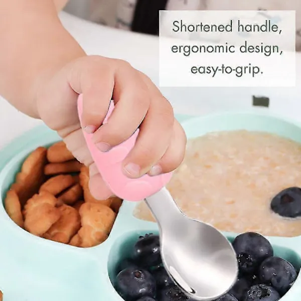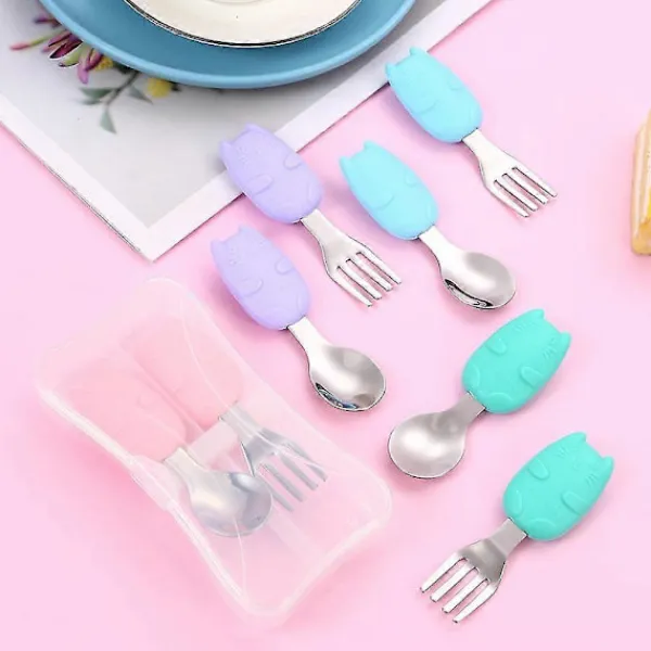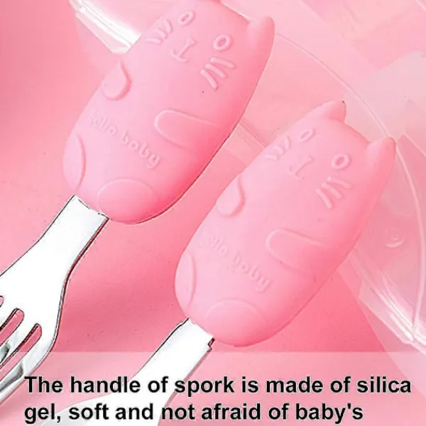 1. Levereras med unika och söta designer, vilket är mycket attraktivt eftersom de ljusa färgerna verkar mycket intressanta för barn i ung ålder. 2. Sked- och gaffelhuvudet är rundat och slätt, det kommer inte att skada ditt barn. 3. Våra gaffel- och skedhuvuden i rostfritt stål är dimensionerade och formade för småbarn. 4. Lätt att rengöra. 5. Den mindre storleken är perfekt för barnets lilla mun, ger dem mest komfort och självförtroende när de lär sig att äta själva.