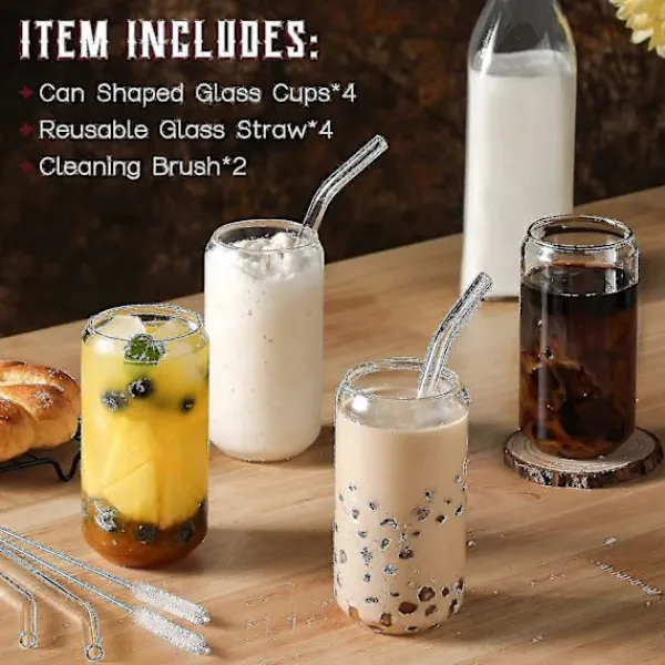 PRODUKTKONFIGURATION: Dricksglasset innehåller 4 burkformade glaskoppar [Diameter – 7,6 cm, Höjd – 14,7 cm], 4 återanvändbara glasstrån och 2 rengöringsborstar