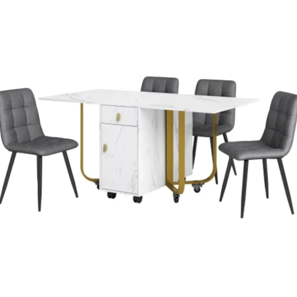 Design: Denna matgrupp kännetecknas av sin moderna design och sitt unika utseende. Den vita MDF-bordsskivan (mått: 150×80×76 cm) i kombination med metallbenen skapar en enkel, stilren atmosfär. Det yttre utseendet är inte bara enkelt och generöst, utan också smakfullt och passar perfekt i olika boendemiljöer.