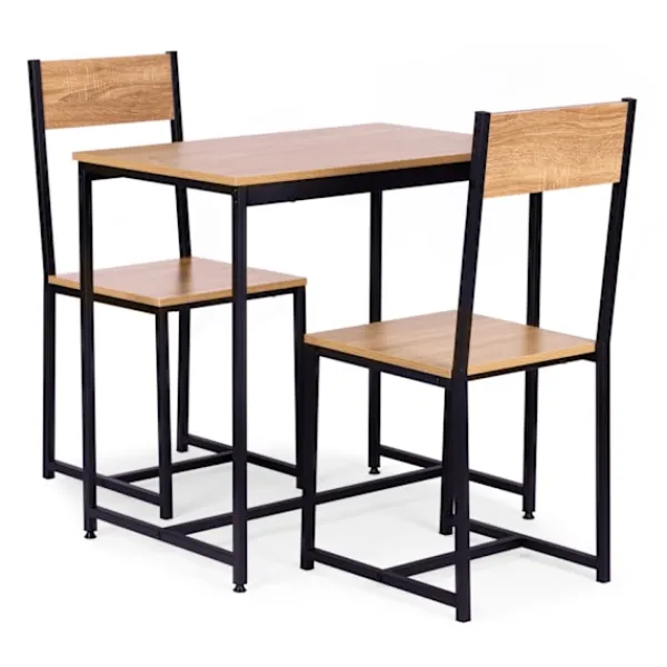Bordsskivan är liksom stolelementen gjord av slitstark MDF-skiva vilket garanterar hållbarhet och reptålighet. Laminatet täckt med MDF imiterar texturen av äkta ek och är dessutom lätt att underhålla. Dess rektangulära form garanterar plats för två personer. Bordsstrukturen är gjord av metallprofiler, benen är avslutade med justerbara säkerhetsfötter.