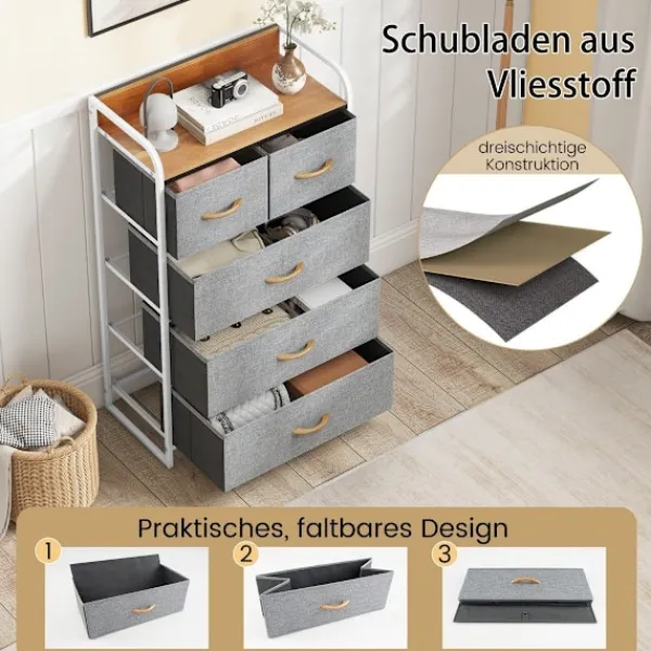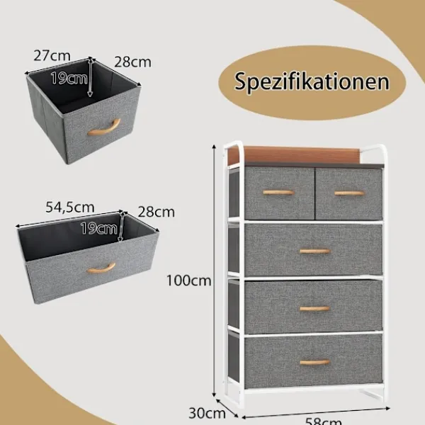 Skåpet har fem rymliga, vikbara lådor gjorda av högkvalitativt tyg som både andas och är giftfritt. Dessa lådor ger gott om utrymme för förvaring av en mängd olika föremål, från kläder och leksaker till hushållsartiklar. Tyget är designat för att motstå slitage, vilket säkerställer långvarig användning. Den robusta stålramen och MDF-panelerna bidrar till skåpets stabilitet, medan de justerbara fötterna skyddar dina golv från repor och säkerställer en vingfri upplevelse.