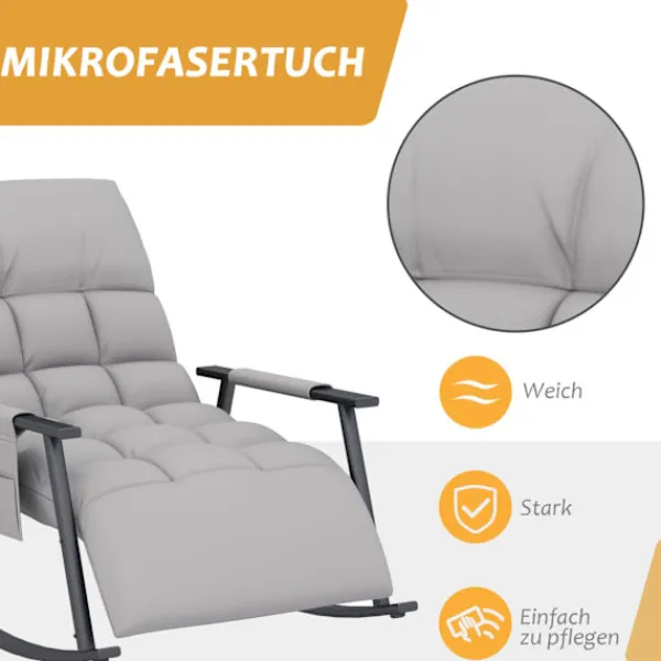 Koppla av i gungstolen och upplev ultimat komfort. Justera fot- och ryggstödet efter eget tycke och njut av oändlig avkoppling. Med den praktiska förvaringsväskan har du allt till hands. Det mjuka mikrofiberöverdraget och den eleganta stålramen gör den här gungstolen till ett riktigt blickfång och gör att den ser bra ut i nästan alla miljöer.