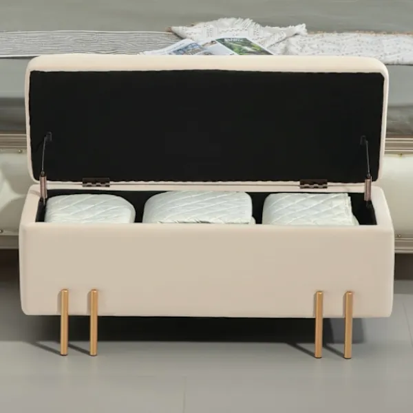 Vår mångsidiga förvaringsbänk är en perfekt blandning av stil och funktionalitet, och erbjuder ett dolt fack med stor kapacitet för att lagra en mängd olika föremål. Oavsett om den placeras i entrén, vardagsrummet eller sovrummet, fungerar denna förvaringsbänk som en förvaringspall, fotstöd eller helt enkelt en sittbänk, vilket ger praktisk och stabil komfort i alla hem.