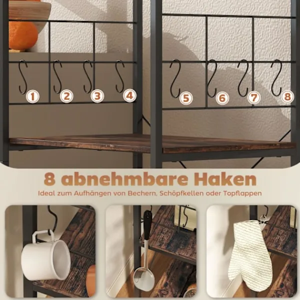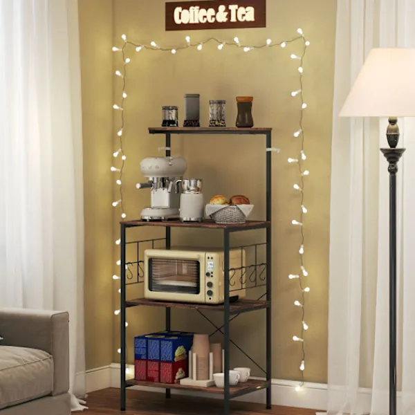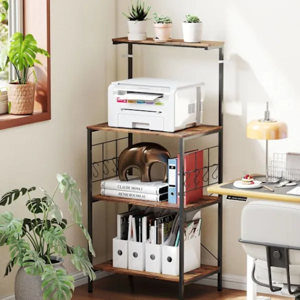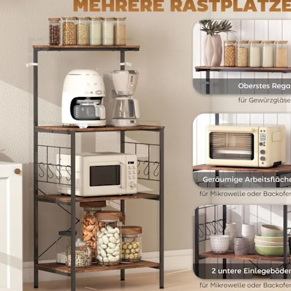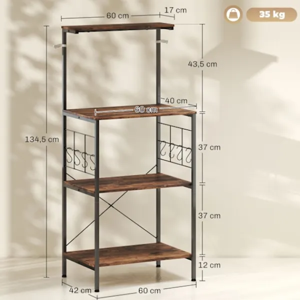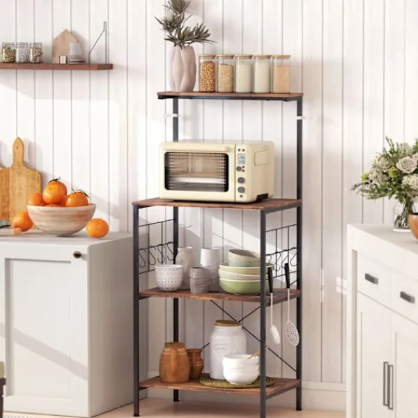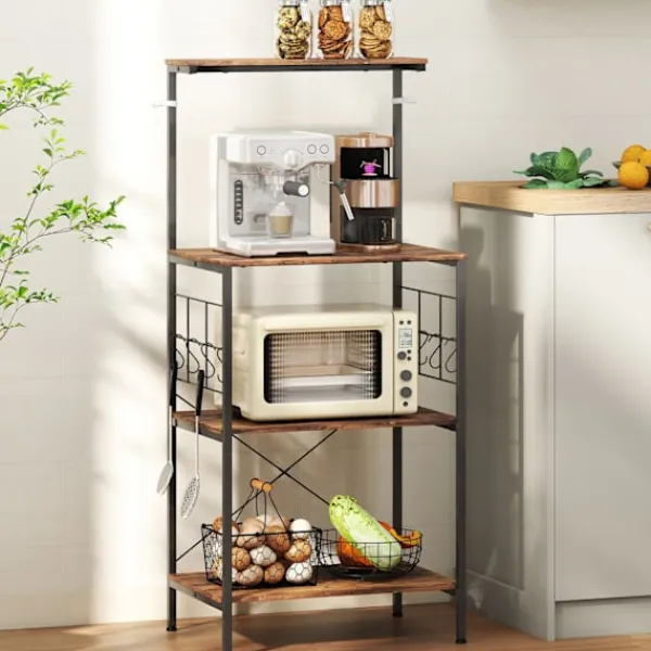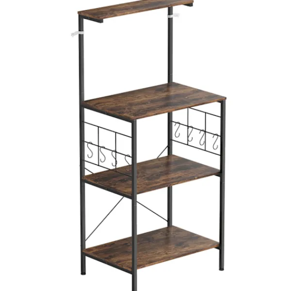 Förvandla ditt kök med ett mångsidigt bakställ som erbjuder gott om förvaring och en rymlig arbetsyta. Perfekt för att organisera mikrovågsugnar, tallrikar och mer, detta ställ har en rustik brun finish med en robust svart ram.