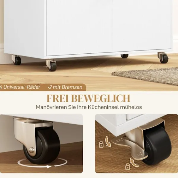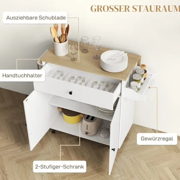 Mobilitet är en nyckelfunktion i denna köksvagn, tack vare dess fyra hjul, varav två är utrustade med bromsar för ökad stabilitet. Detta gör det enkelt att flytta runt vagnen i ditt kök eller matplats efter behov. Lådan fungerar smidigt på glidskenor och de magnetiska dörrgångjärnen ser till att skåpdörrarna stängs säkert. Den melaminbelagda ytan ger inte bara en touch av elegans utan gör också rengöringen till en lek och behåller vagnens orörda utseende.