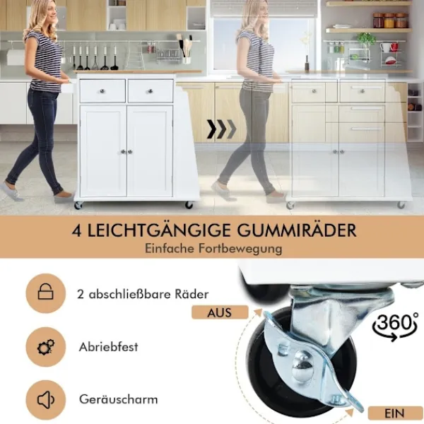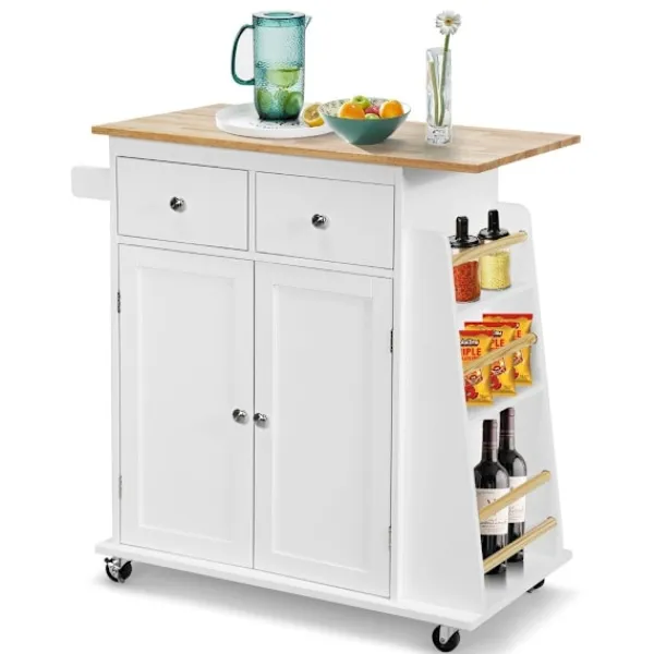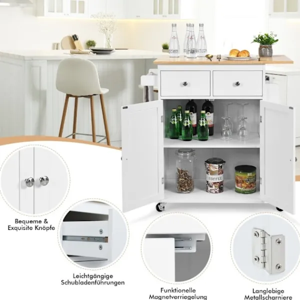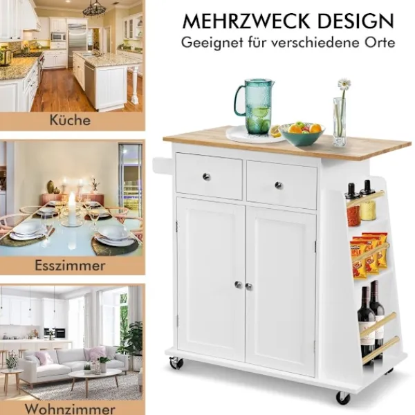 Förvandla dina köksuppgifter till en härlig upplevelse med vår eleganta köksvagn. Denna mångsidiga köksö på hjul är designad för att erbjuda gott om förvaring och organisation för dina nödvändiga kökssaker. Tillverkad med en bred bänkskiva i massivt trä, ett tvådörrarsskåp, två lådor, en handdukshållare och ett trevånings kryddställ, säkerställer denna köksvagn att din matlagningsplats förblir rörig och effektiv.