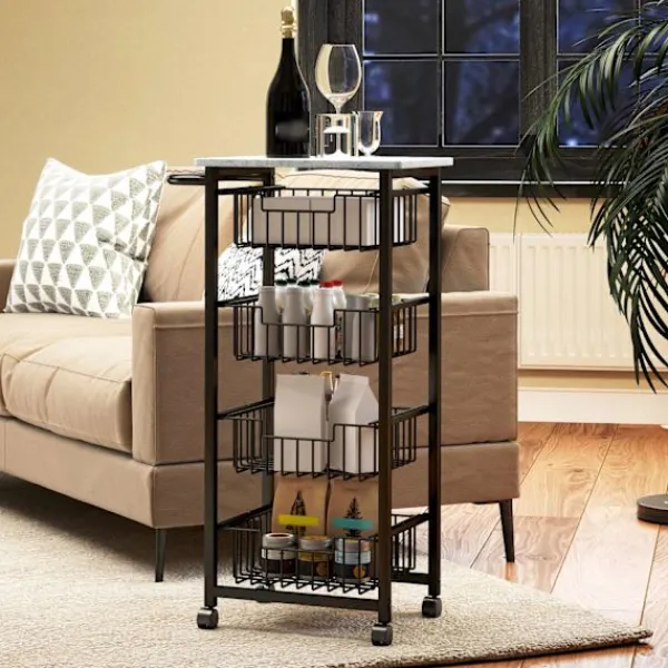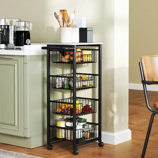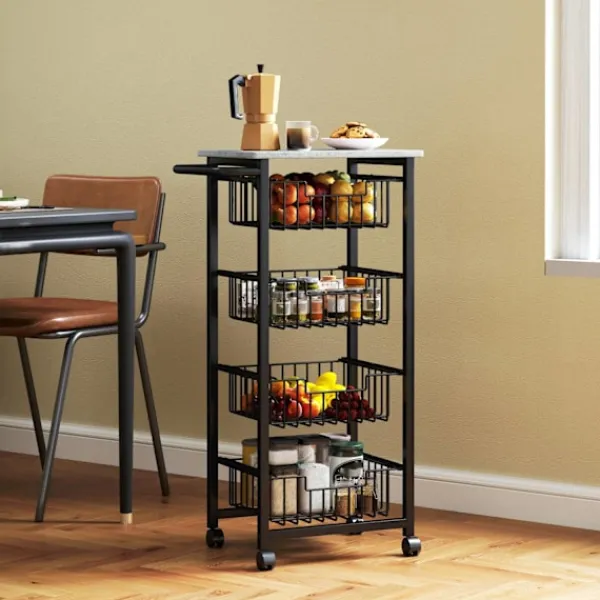Förbättra ditt kök med en mångsidig rullande köksvagn med en rymlig bänkskiva och fyra utdragbara korgar för effektiv matlagning och organisering.