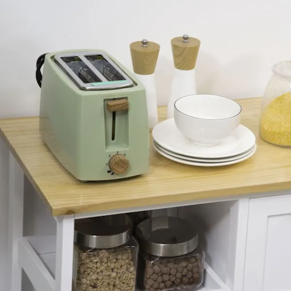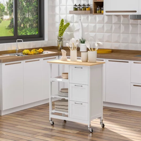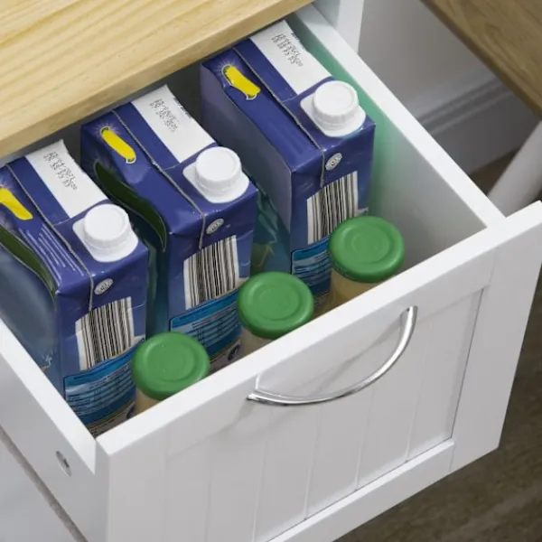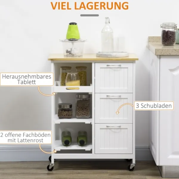 Ordna ditt kök med denna snygga rullande förvaringsvagn från . MDF-ramen är stabil och pålitlig och lämpar sig för dagligt bruk. Den har tre utdragbara lådor, en löstagbar bricka och två öppna hyllor. En träbordsskiva ger dig extra utrymme för förberedelser. En kompakt och funktionell köksvagn som inte kan saknas i ditt hem.