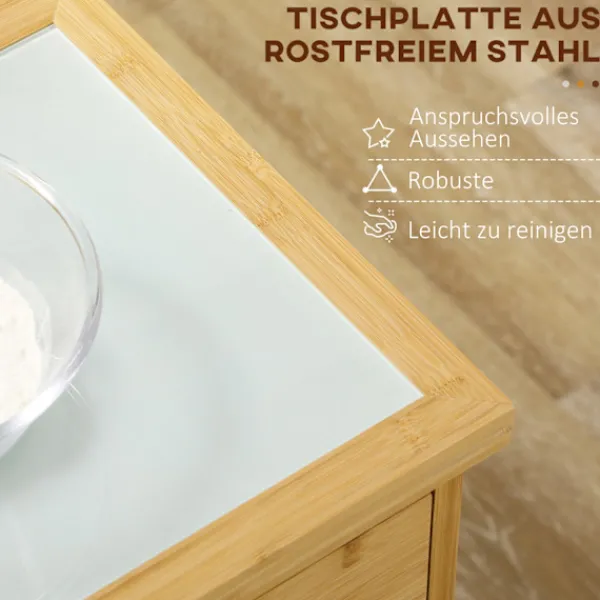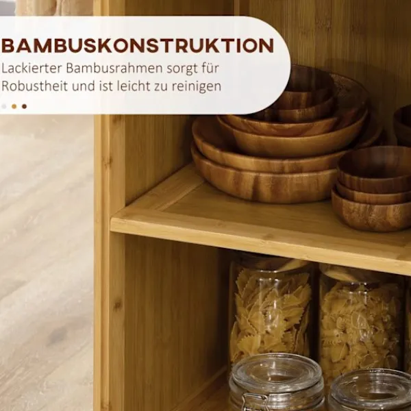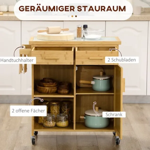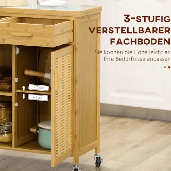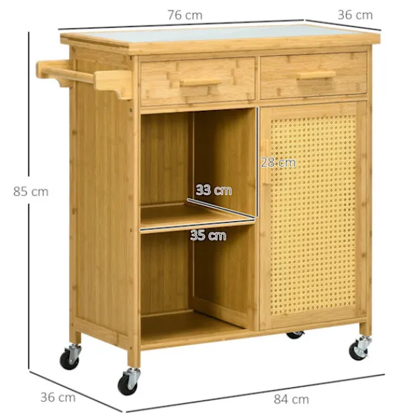 Maximera utrymmet i ditt kök och håll ordning och reda med denna köksvagn i bambu. Med sin rottingdörr och platsbesparande förvaringsmöjligheter, ett skåp, två förvaringsfack och två lådor är det en mångsidig och stilren köksmöbel. Den här lilla köksön rör sig lätt runt i rummet på låsbara hjul, vilket ger bekvämligheten precis där den behövs som mest. Uppgradera ditt kök idag med den här förvaringsvagnen.
