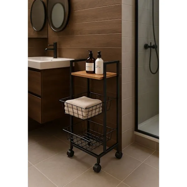 Förvandla ditt utrymme med vårt mångsidiga mobila ställ, perfekt för kök, badrum och annat. Denna kompakta förvaringslösning har en hållbar melaminbelagd MDF-hylla och en robust pulverlackerad metallram, vilket säkerställer både stil och motståndskraft. Med hjul för enkel rörlighet och lås för stabilitet är det den ultimata arrangören för alla rum.