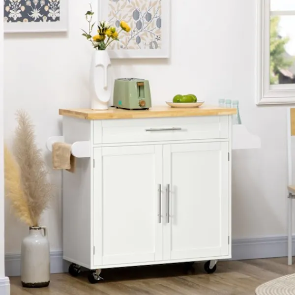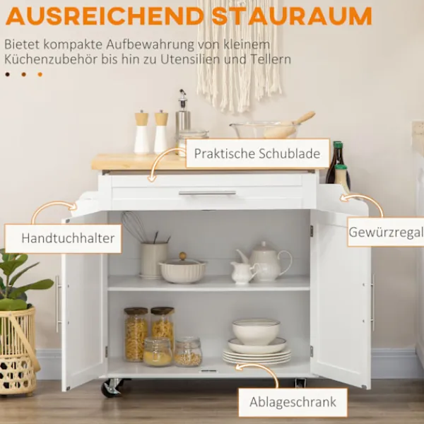 Denna köksvagn från är den idealiska lösningen för mer ordning och komfort i hemmet. En praktisk låda och ett stängt skåp ger gott om plats för köksredskap och mat. Det integrerade kryddstället och handdukshållaren ger extra komfort. Tack vare de fyra hjulen är köksvagnen lätt att flytta. Två parkeringsbromsar säkerställer ett säkert stativ Det är enkelt att hålla ordning med den praktiska serveringsvagnen från.