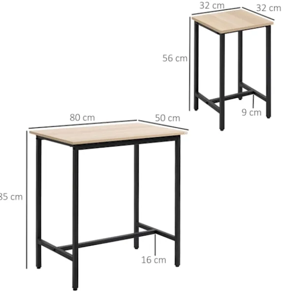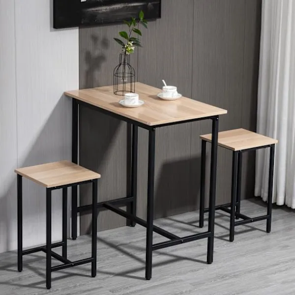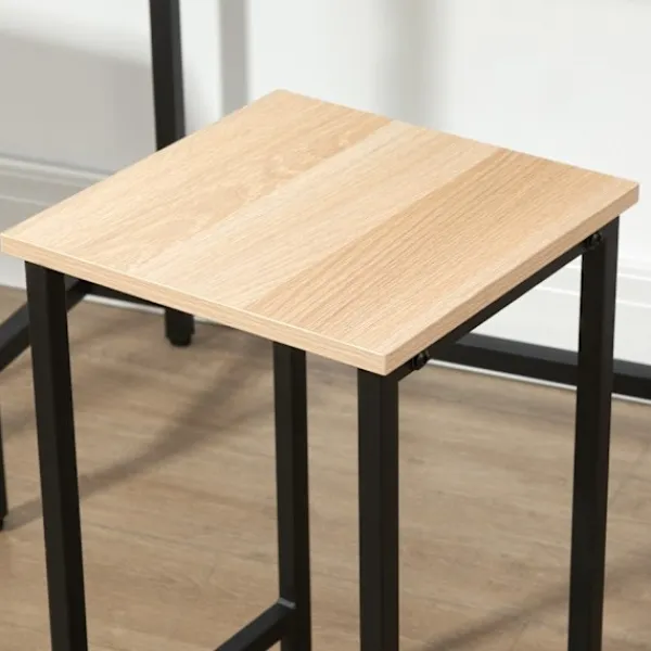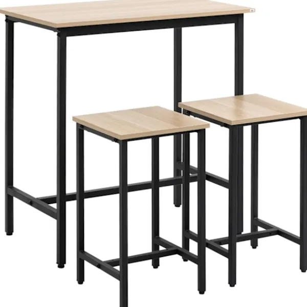 Detta barbord med barstolsset från imponerar med sitt trendiga industriella utseende och smarta, platsbesparande design. Kombinationen av svart metall och en ovandel i trälook ger denna möbel ett trendigt industriellt utseende. Ett bistrobord med 2 stolar erbjuder en bekväm sittplats för 2 personer. Tack vare sin smarta design kan pallarna skjutas in under det höga bordet för att spara utrymme när de inte används.