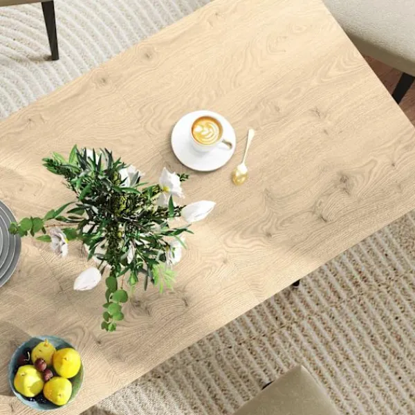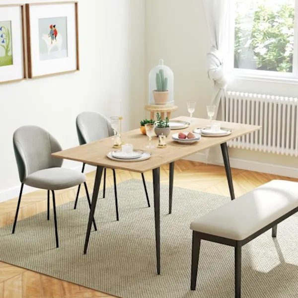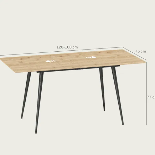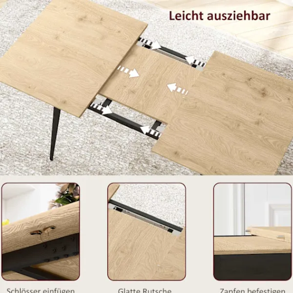 Det utdragbara matbordet är tillverkat av högkvalitativ MDF med en melaminbeläggning, vilket ger en hållbar och lättstädad yta som motstår fläckar och repor. Det utdragbara bladet förvaras bekvämt under bordsskivan, så att du enkelt kan justera bordets storlek med hjälp av glidskenor och säkra lås. Denna funktion säkerställer att bordet förblir robust och pålitligt, oavsett om det är helt utdraget eller i sin kompakta form.