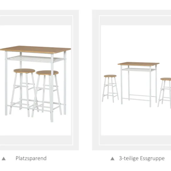 Detta 3-delade barbord och stolset från kommer med ett högt bord och två barstolar. Bistrobordet med 2 stolar är särskilt lämpligt för små kök. Ett förvaringsfack under bordsskivan fungerar som en hylla för vardagliga föremål som tidningar, frukt och kökstillbehör. Detta matsalsset är tillverkat av metall och MDF-trä. Konstruktionen är solid och stabil. Detta barbordsstolset från imponerar med sin praktiska design och sin unika industriella stil.