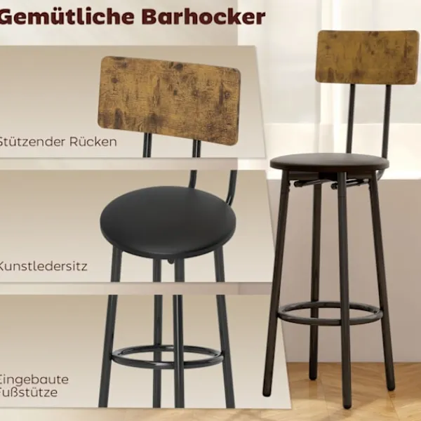 Förvandla vilket litet utrymme som helst till en välkomnande vrå med detta kompakta barbordsset, med rustik träfinish och robust svart metallram för industriell charm. Köksbänken i två nivåer håller dina nödvändigheter organiserade och lättillgängliga, medan två vadderade pallar med stödjande ryggstöd säkerställer varaktig komfort för frukost eller drinkar.