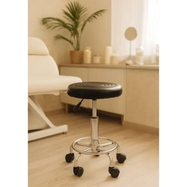 Den vridbara pallen med ryggstöd erbjuder ergonomiskt stöd och rörlighet, perfekt för skönhetssalonger, medicinska kontor och mer. Dess slitstarka PVC-läder och justerbara höjd garanterar komfort under långa timmar.