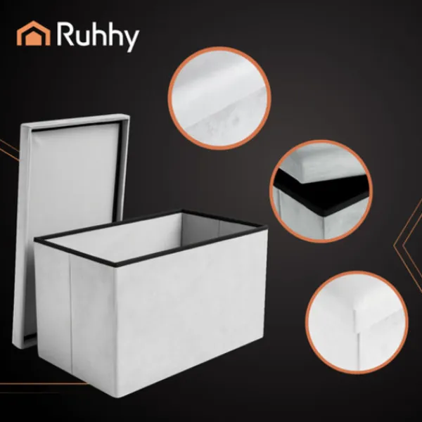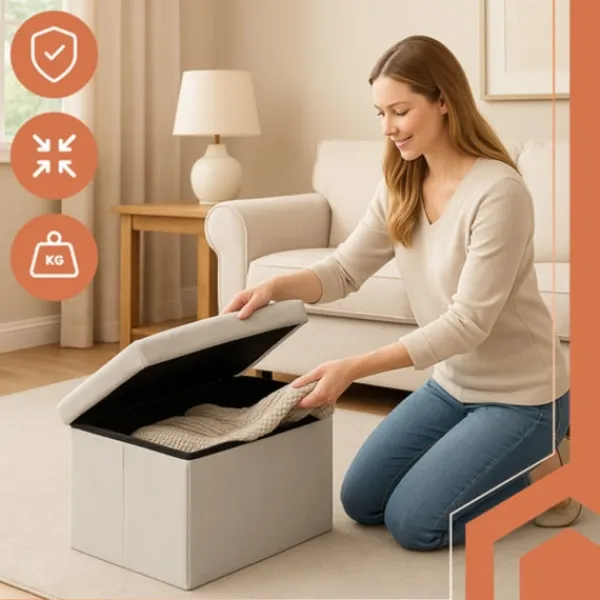 Den hopfällbara förvaringspuffen erbjuder en mångsidig sitt- och förvaringslösning, som kombinerar vattenbeständig sammet med MDF-förstärkning för hållbarhet. Njut av en mjuk sits och ett rymligt 54-liters fack för förvaring av nödvändigheter.