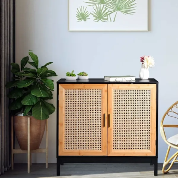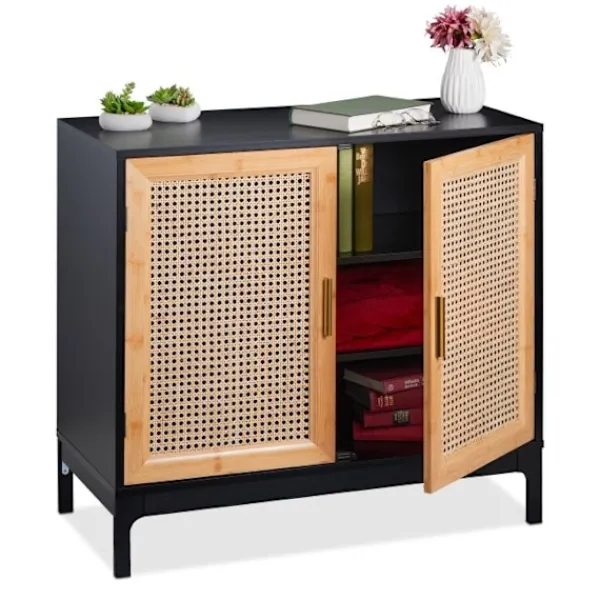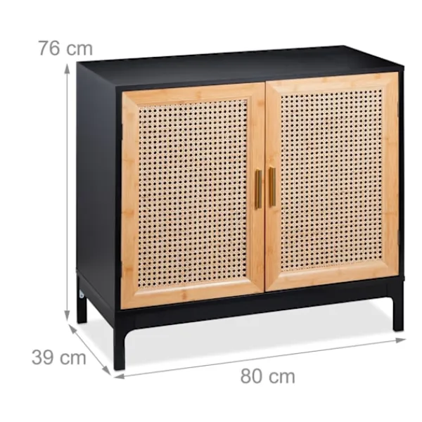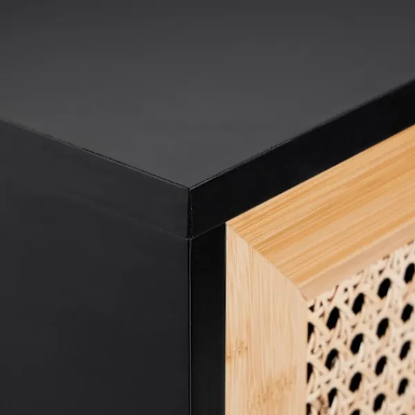 Detta sideboard ger ditt hem en exotisk känsla och tidlös elegans. Den robusta stommen i svart trälook kontrasterar vackert mot dörrarna i naturlig bambu med rottingväv. Insidan av byrån med sina 3 fack erbjuder förvaringsutrymme för böcker, DVD-skivor med mera, medan hyllan kan användas för att förvara dekorationer. Skåpet är en fantastisk retromöbel som passar in i många boendekoncept och fungerar som ett snyggt tillskott till vardagsrummet eller hallen.