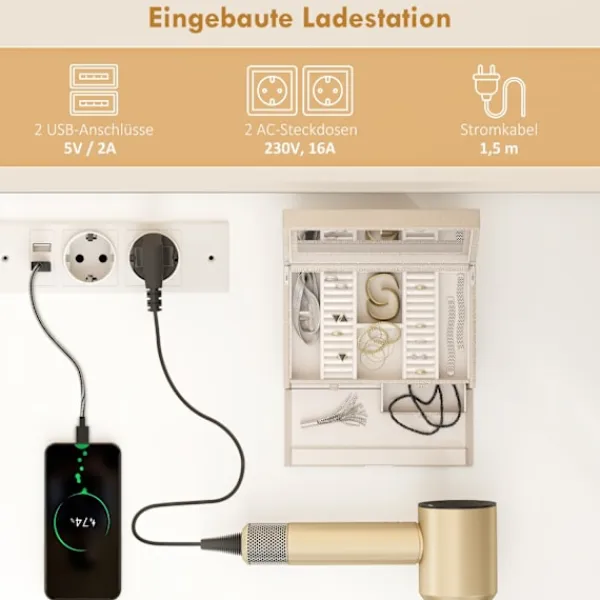 - Strömenheter och stylingverktyg med två AC-uttag och två USB-portar.