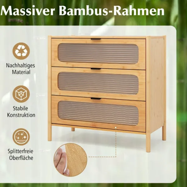 Upptäck elegans och funktionalitet med vår bambubyrå med 3 lådor, designad för att förbättra ditt utrymme samtidigt som den bär upp till 110 kg. Dess räfflade glasfronter och eleganta handtag ger en touch av sofistikering.